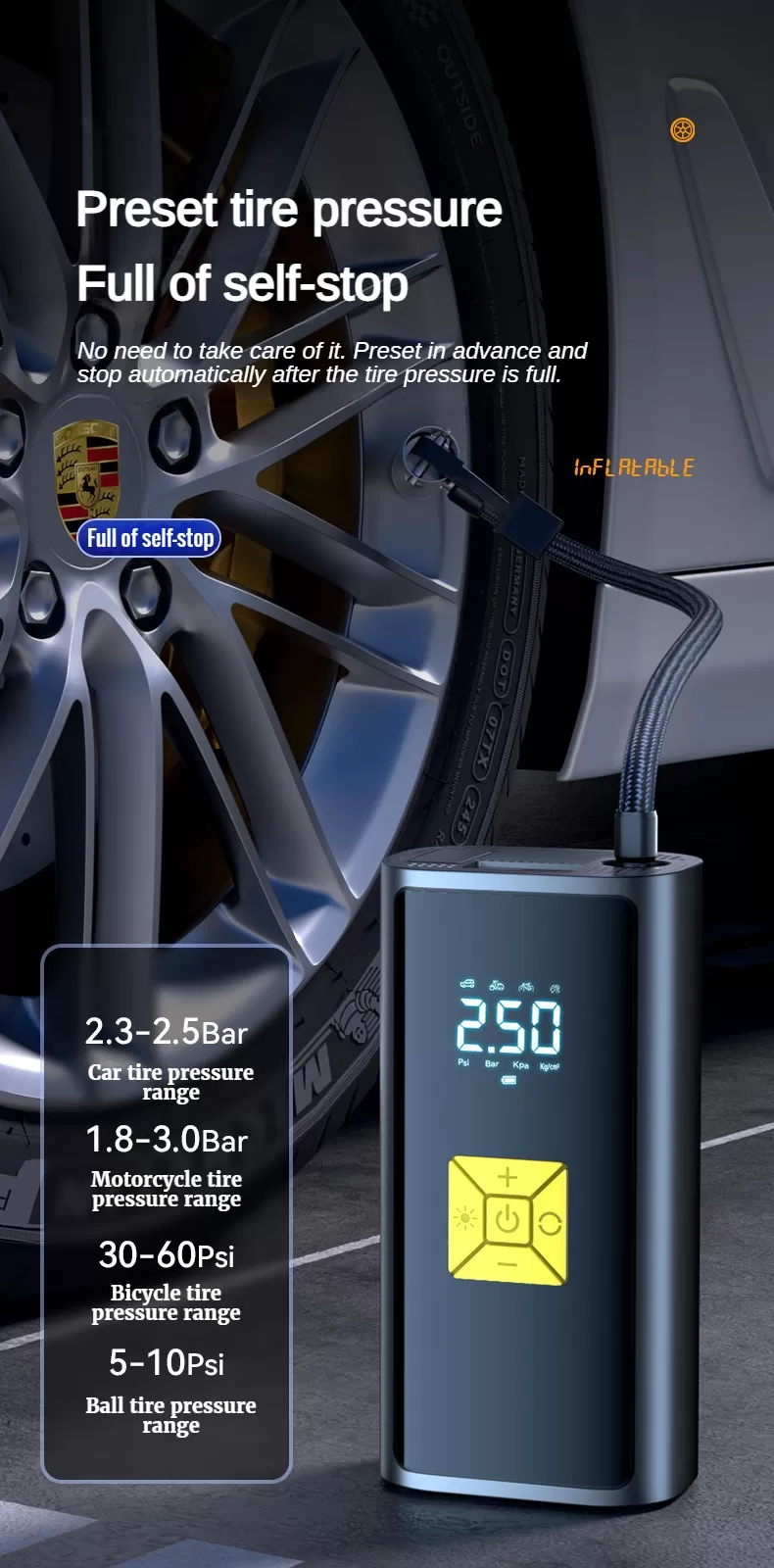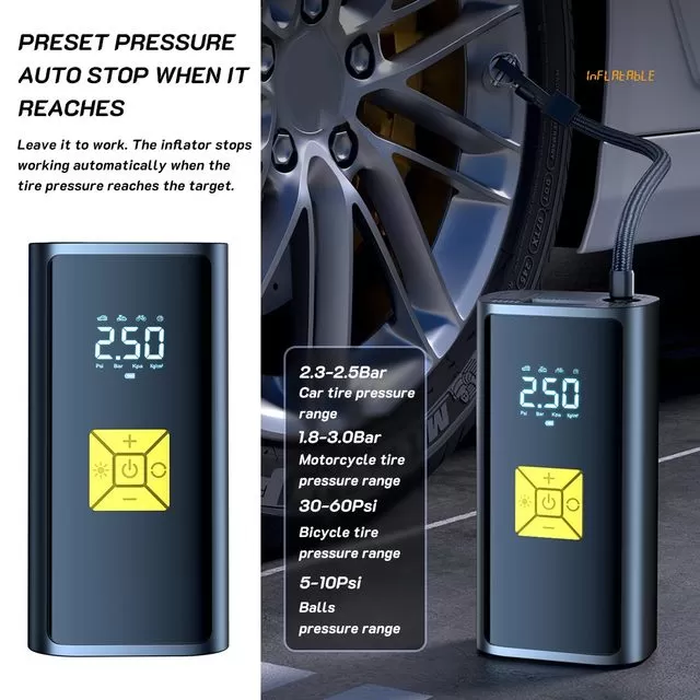 "استمتع بالراحة مع مضخة الهواء الذكية المحمولة - مثالية لنفخ الإطارات والمعدات الرياضية في أي وقت."