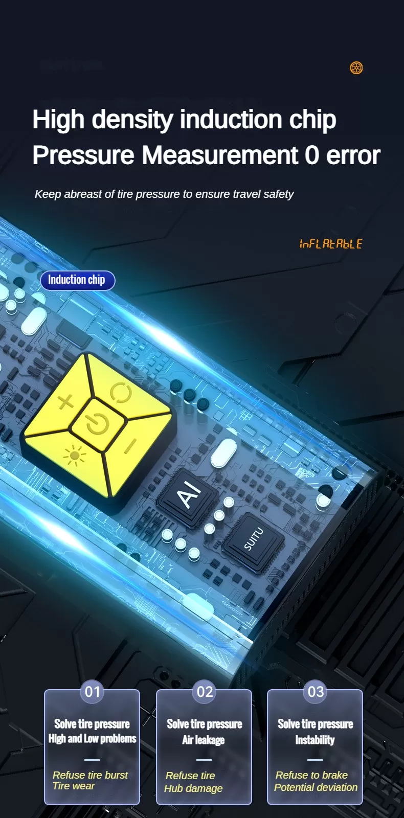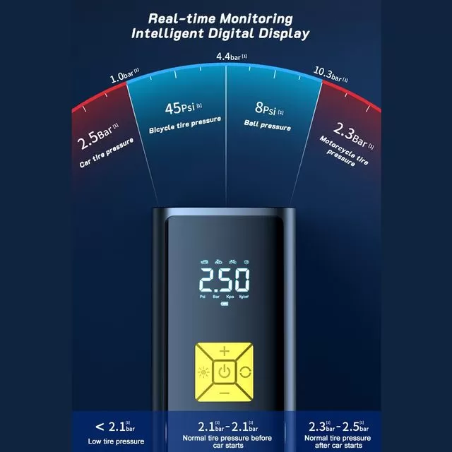 "مضخة هواء ذكية: شاشة رقمية لضبط ضغط الهواء بدقة وضمان السلامة."